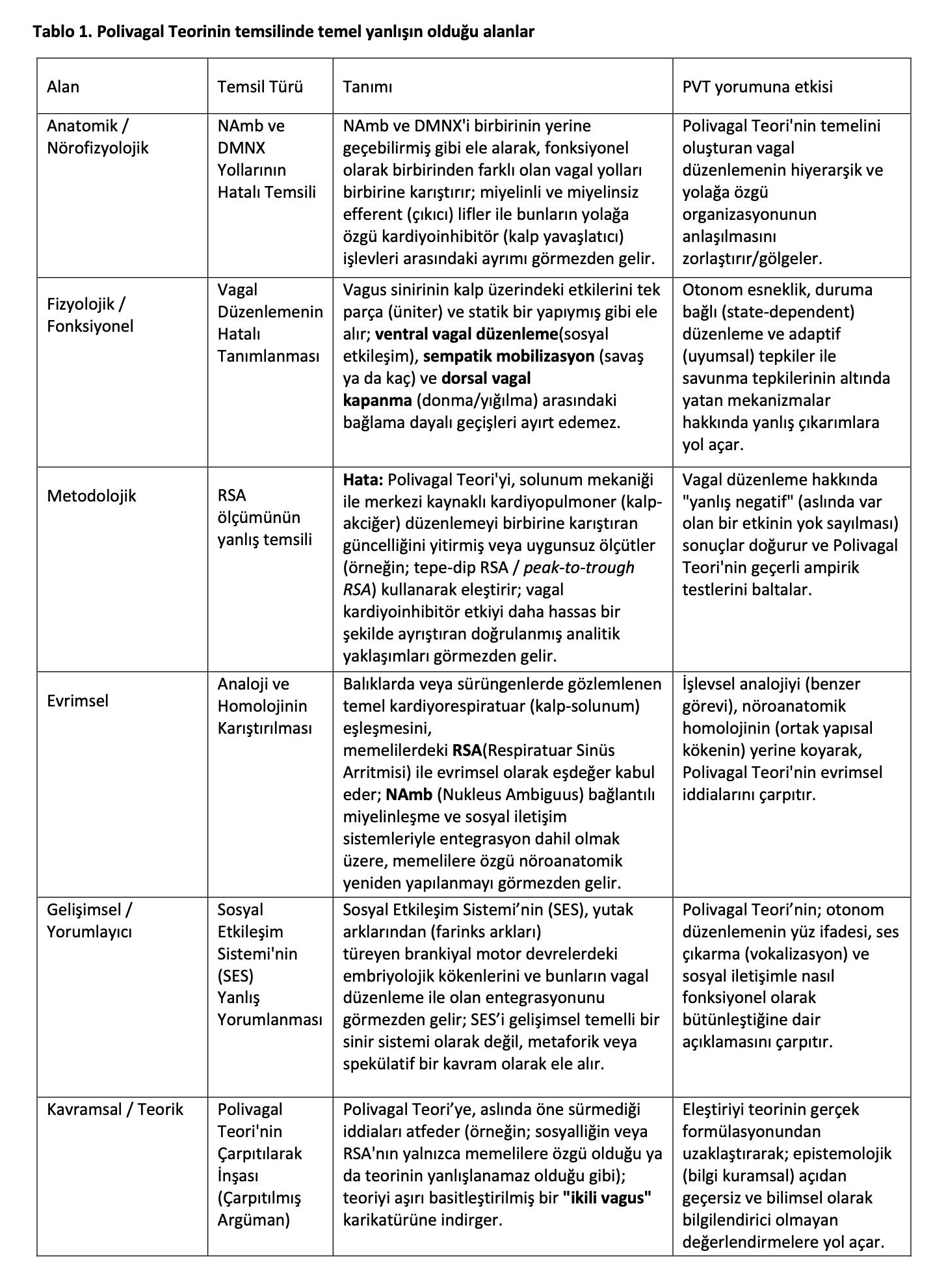 Bu yanlış yorumlamaların mahiyetine açıklık getirmek amacıyla Tablo 1; Polivagal Teori’ye yönelik eleştirilerde sürekli tekrarlanan hata alanlarını belirlemekte, bunların nasıl ortaya çıktığını ve teorinin doğru yorumlanması üzerindeki sonuçlarını ana hatlarıyla ortaya koymaktadır.