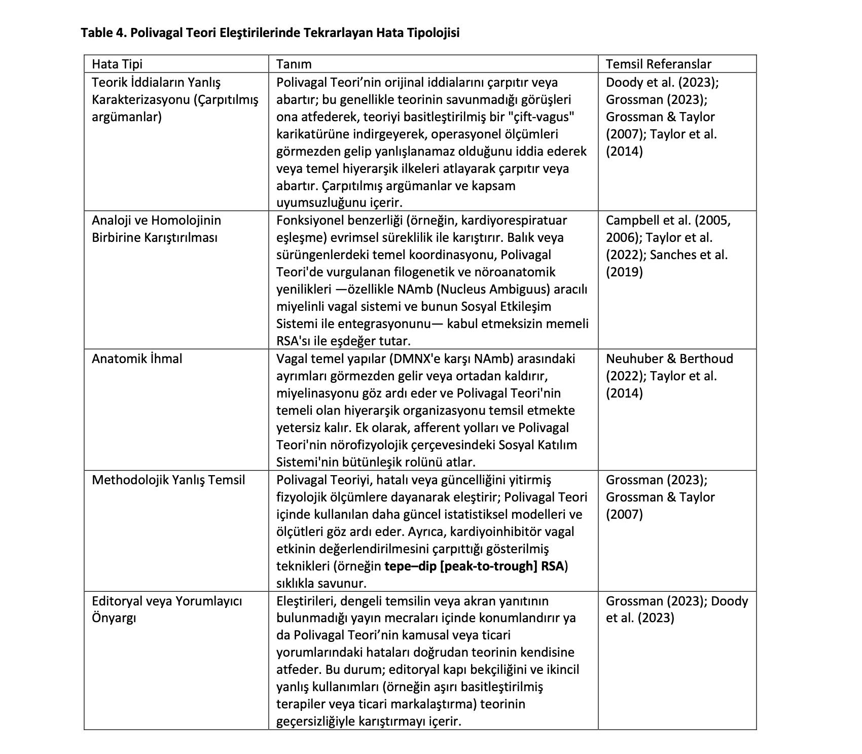 Polivagal Teori eleştirilerinde tespit edilen tekrarlayan sorunları sentezlemek için, Tablo 4, yaygın hata kategorilerinin bir tipolojisini sunmaktadır. Bunlar, retorik yanlıştemsillerden ampirik ve metodolojik hatalara kadar uzanmaktadır. Her hata türütanımlanmış, yayınlanmış eleştirilerdeki görünümüyle örneklendirilmiş ve ortaya çıkanbilimsel çarpıtma ile eşleştirilmiştir.