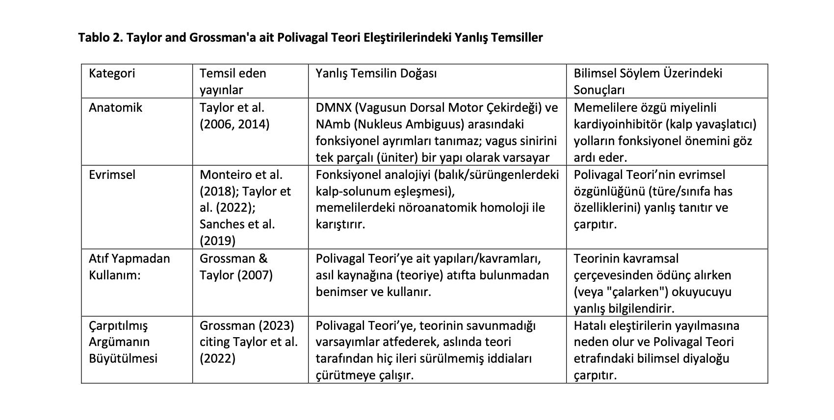 Tablo 2'de gösterildiği gibi, Taylor'ın yayınları tekrar eden bir yapıda, indirgemeci yaklaşım ile anatomik ayrımları gözardı ederek , Polivagal Teori'nin merkezinde yer alan filogenetik yapıları birbirine karıştırıyor.Grossman’ın sonraki yazıları, bu yanlış sunumları daha da büyüterek; retorik açıdan otoriter bununla birlikte ampirik açıdan hatalı eleştirilerin içine yerleştirmektedir.. Bu hata mirası,hem akademik hem de kamusal alanlarda Polivagal Teori'nin katmanlı bir şekilde yanlıştanımlanmasına katkıda bulunuyor