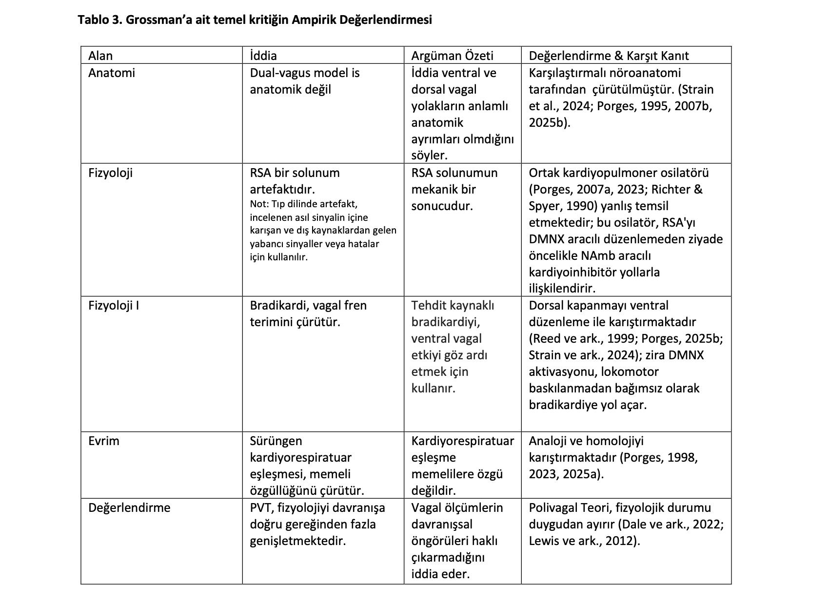 Tablo 3, yalnızca Grossman'ın eleştirilerini çürüten nörobilimsel kanıtların bir özeti olarak değil, aynı zamanda Polivagal Teorinin içsel tutarlılığının bir göstergesi olarak da işlev görmektedir. Nöroanatomi, fizyoloji, gelişimsel psikobiyoloji ve evrimsel biyolojialanlarındaki çağdaş bulgularla uyumlu hale gelerek, teori kavramsal bütünlüğünü vedisiplinler arası tutarlılığını korur; bu da indirgemeci eleştiriye karşı savunmasızlığındanziyade açıklayıcı sağlamlığını vurgular.